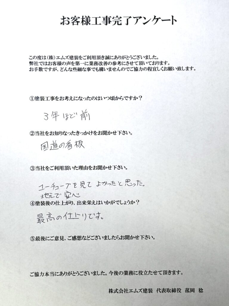 塗装工事をお考えになったのはいつ頃からですか? 3年ほど前 当社をお知りになったきっかけをお聞かせ下さい。 国道の看板 当社をご利用頂いた理由をお聞かせ下さい。 ユーチューブを見て良かったと思った。 地元で安心 塗装後の仕上がり、出来栄えはいか… -