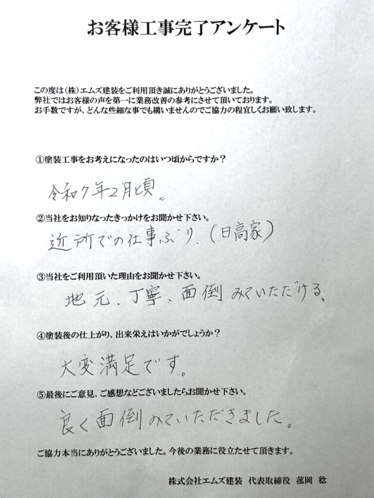 塗装工事をお考えになったのはいつ頃からですか? 令和7年2月頃 当社をお知りになったきっかけをお聞かせ下さい。 近所での仕事ぶり(日高家) 当社をご利用頂いた理由をお聞かせ下さい。 地元・丁寧・面倒みて頂ける。 塗装後の仕上がり、出来栄えはいか… -